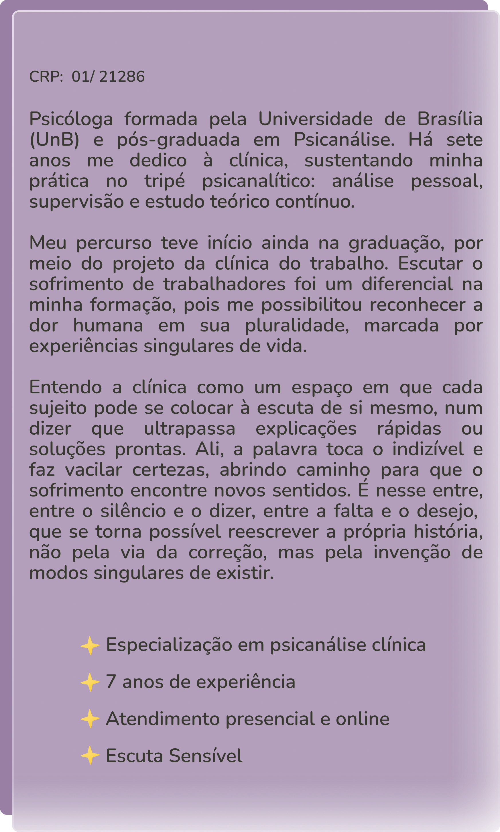 Atendimentos para adultos que carregam angústias, dúvidas ou medos, e que desejam encontrar um espaço seguro para falar de si, se escutar e buscar novos caminhos.